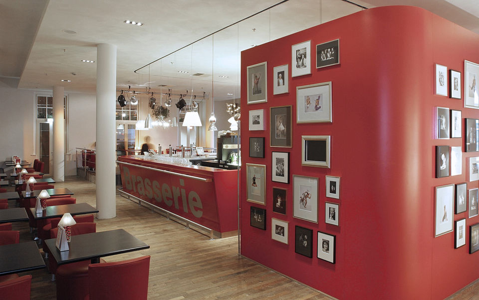 Part of the architectural icon, the Chassé Theater, designed by architect Herman Hertzberger, is located in the monumental Kloosterkazerne. Dating back to 1504, the Kloosterkazerne has been used as the Holland Casino since 2003. M+R Interior Architecture was part of the design team for the building’s repurposing. During the design process, the theater asked us to create a design for the brasserie. The old theater café had to make way for a new entrance and parking garage for both the theater and casino. For the brasserie, we developed a concept featuring an iconic central red bar, with a series of design lights slowly moving above. The monumental space is fitted with barracks-style parquet, and the old wrought-iron columns from the monument are preserved. The bar and restroom area were integrated into the space, allowing the building's original structure to remain clearly visible. The lamps and interactive photos create a theatrical effect, constantly changing the space.