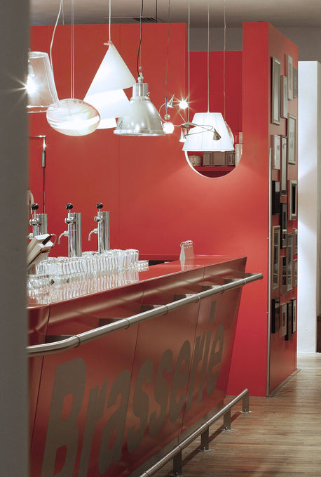 As part of the concept to make the theater more accessible and open outside of its regular programming, M+R developed a flexible workspace and hospitality concept. The flexible workspace, CHASSE CONNECT, is located above FRONT, featuring a pallet of red-colored furniture and upholstery as a nod to the theater. The space includes various workstations and design icons for flexible workers. A large relief wall with theater and film posters completes the space. In the foyer, the GERECHT hospitality concept is situated at the entrance, where visitors can enjoy lunch during the day, and theater-goers can order a simple meal before the show in the evening. The back wall is a fully stainless-steel cabinet with a translucent transparent back, featuring LED lighting that can change color. The cinema bar above the foyer has been completely redesigned, with the bar and back bar forming a monolithic element.